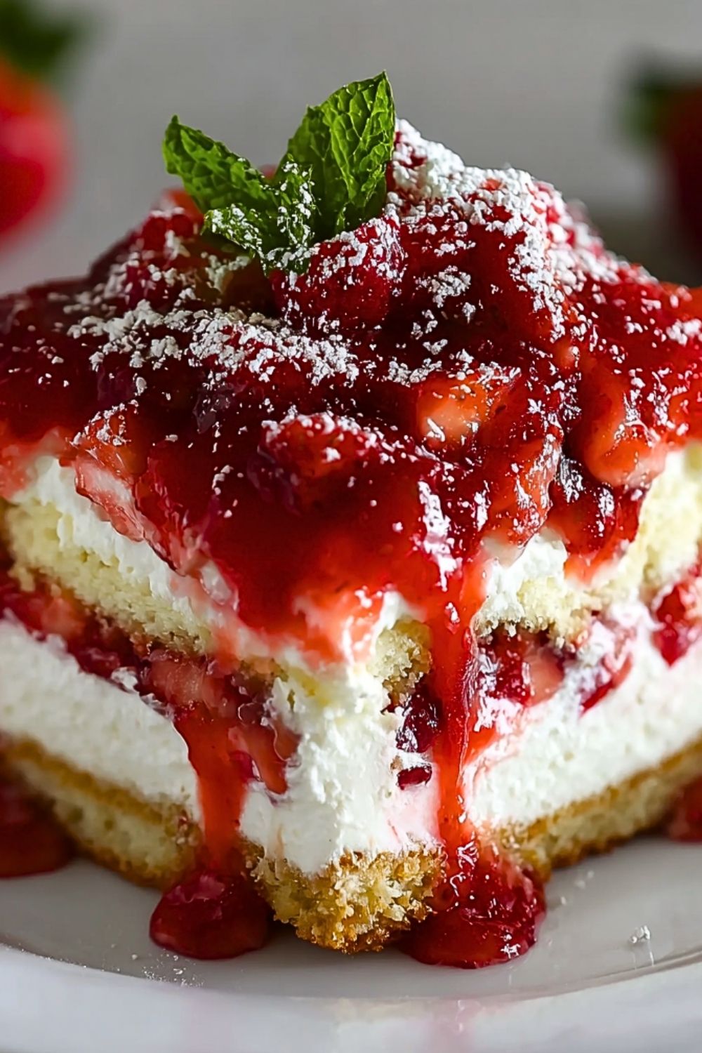 13. Before serving, garnish with whole strawberries, mint leaves, and a dusting of powdered sugar.