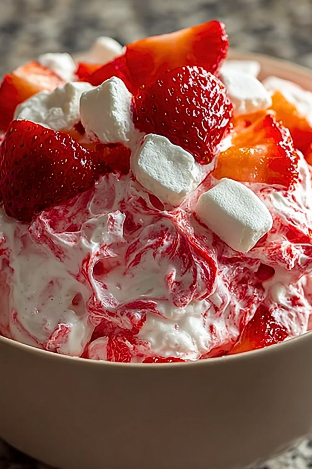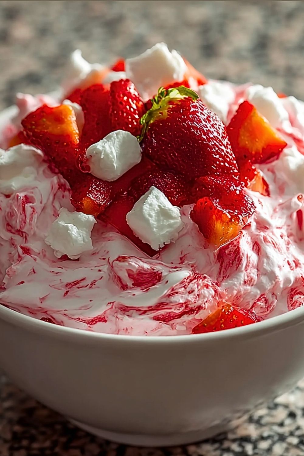 The magic behind this recipe lies in the combination of whipped topping and flavored gelatin. Together, they create that signature airy texture that feels almost mousse-like. When folded gently with the strawberries and marshmallows, everything blends into a smooth, fluffy mixture that holds its shape while still feeling light on the palate.