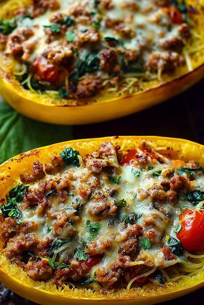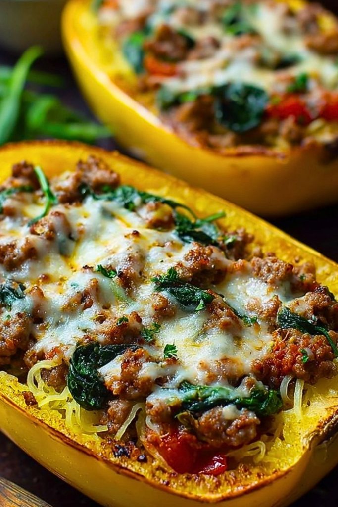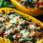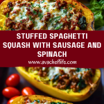 Keywords: stuffed spaghetti squash, low carb dinner, sausage and spinach recipe, easy weeknight meal, gluten free dinner, squash boat recipe, healthy comfort food