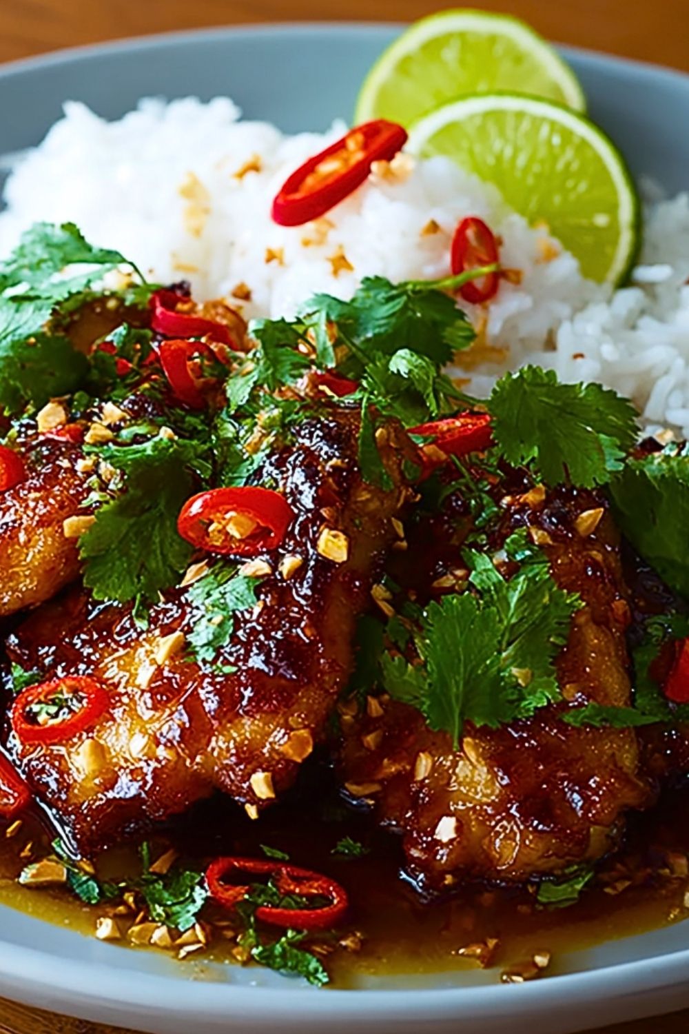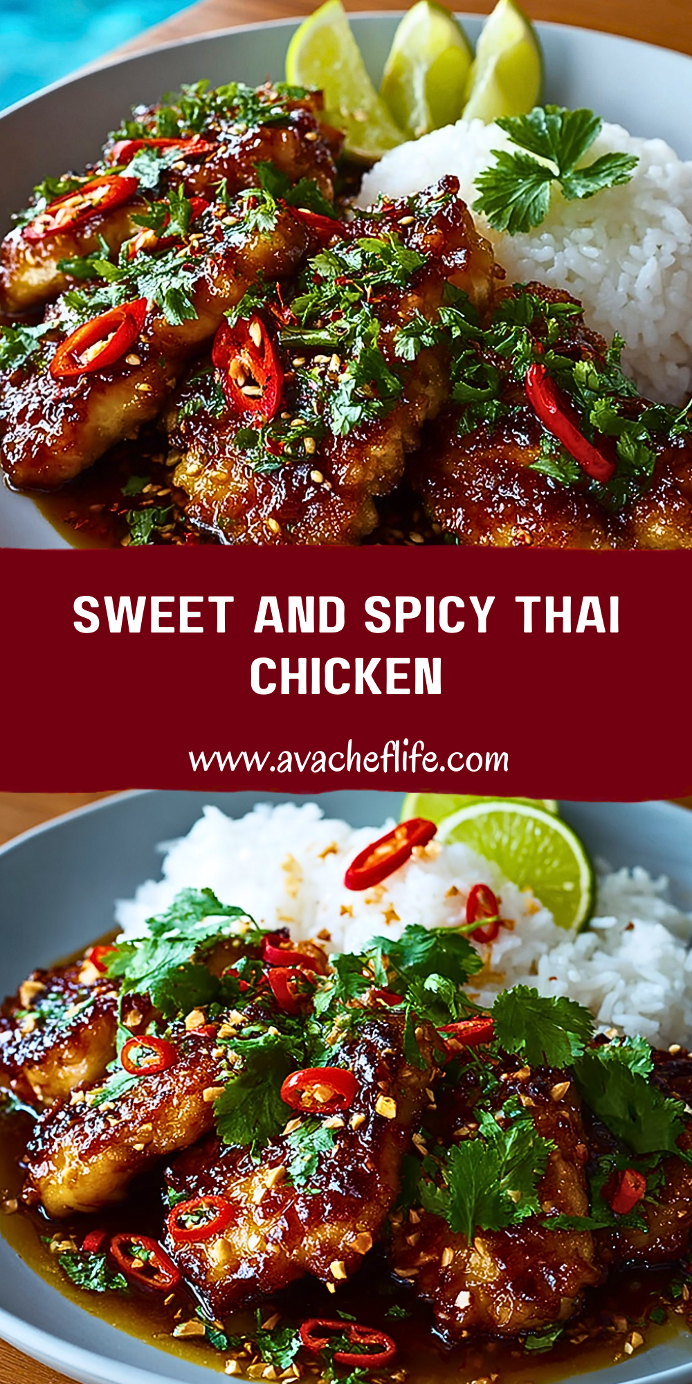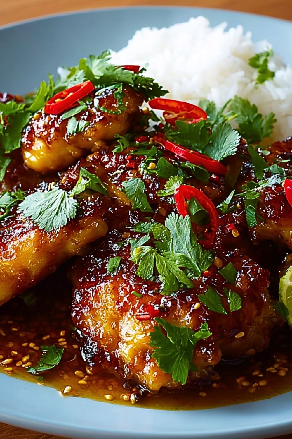 Transfer the Sweet and Spicy Thai Chicken to a serving plate. Garnish with chopped cilantro, extra sliced chilies, toasted sesame seeds, and lime wedges. Serve immediately with jasmine rice or noodles.