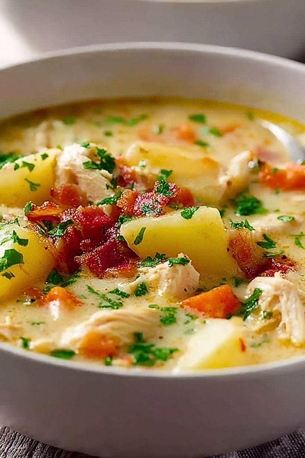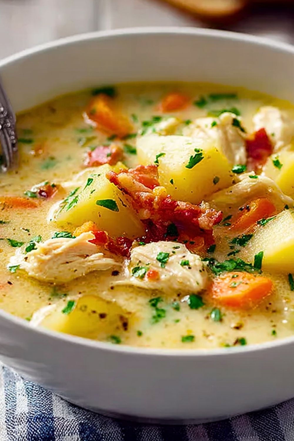 Keywords: chicken potato soup, cozy dinner, creamy soup, easy soup recipe, one pot meal