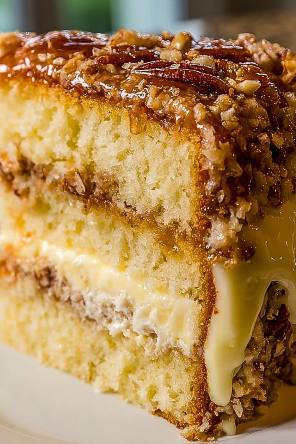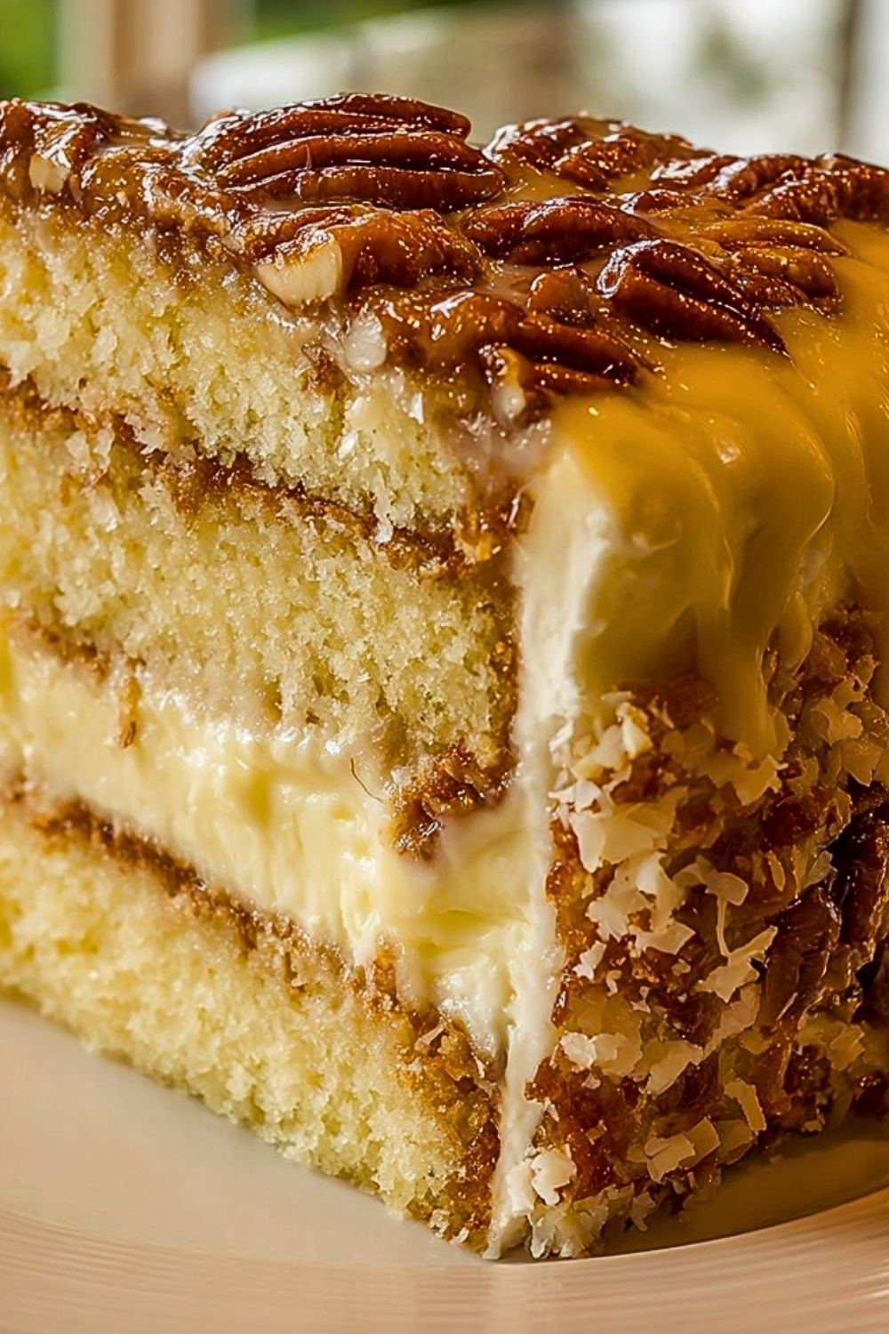 Add the second cake layer over the cheesecake, gently pressing down to secure the layers. Spread the coconut-pecan topping generously over the top, allowing some to drip slightly down the sides for a rustic look.